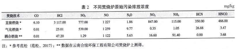 表2匯總了直接燃燒(兩段式:一燃室和二燃室)、氣化燃燒和熱解耦合燃燒污染物原始排放現(xiàn)場檢測值,數(shù)據(jù)表明,除NO:和NO污染因子外,直接焚燒系統(tǒng)污染物原始濃度都是最高的,而熱解耦合焚燒污染因子原始濃度相對較低,特別是HCl、S02、HCN和HNCO等污染因子,該揮發(fā)分和碳的耦合燃燒在這方面具備較好的優(yōu)勢。