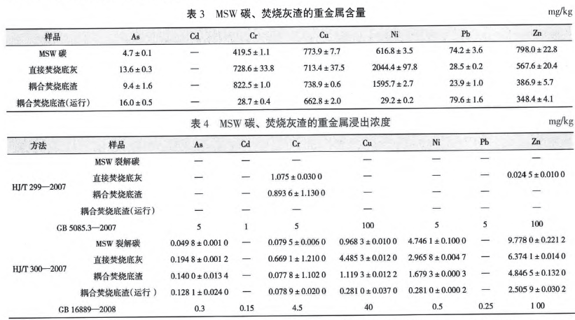 表3顯示:直接焚燒底灰中的As、Ni、Cu和zn的含量較高,而耦合焚燒底渣中Cr、Nj的含量也較高。HJ/T 299--2007浸出試驗方法采用了酸化的去離子水作為浸出液,固液比為10,由標準GB 5085.3—2007來判斷飛灰是否為危險廢物HJ/T 300---2007的試驗方法采用了醋酸作為提取液,固液比為20,由標準GB 16889—2008來判斷廢物是否適合衛(wèi)生填埋。表4中的數(shù)據(jù)表明,底灰和爐渣均適合填埋,雖玻璃化底渣保留了大部分重金屬,但因其低滲出性,仍然可以按衛(wèi)生填埋方式安全處置。