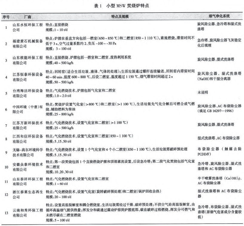 筆者將討論小型焚燒爐的適用原則和運行特點,并對提高環(huán)境污染控制水平提出建議。 國內(nèi)的小型MSW焚燒爐主要有3種類型:直接焚燒、氣化燃燒和熱解燃燒,典型的焚燒爐產(chǎn)品見表1,處理能力通常小于50 d/t。