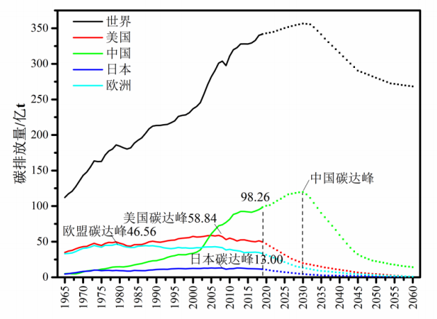 根據(jù)BP數(shù)據(jù),2019年我國二氧化碳排放量為98.26億噸,占世界的28.8%。從我國與歐盟、美國等歷史碳排放量和預期增長趨勢看(圖1),歐盟、美國、日本在1979年、2007年、2008年已實現(xiàn)碳達峰。我國十八大報告指出,要大力推進生態(tài)文明建設,堅持節(jié)約資源和保護環(huán)境的基本國策,堅持節(jié)約優(yōu)先、保護優(yōu)先、自然恢復為主的方針,著力推進綠色發(fā)展、循環(huán)發(fā)展、低碳發(fā)展,形成節(jié)約資源和保護環(huán)境的空間格局、產(chǎn)業(yè)結構、生產(chǎn)方式,從源頭上扭轉(zhuǎn)生態(tài)環(huán)境惡化趨勢,為人民創(chuàng)造良好生產(chǎn)生活環(huán)境,為全球生態(tài)安全作出貢獻。