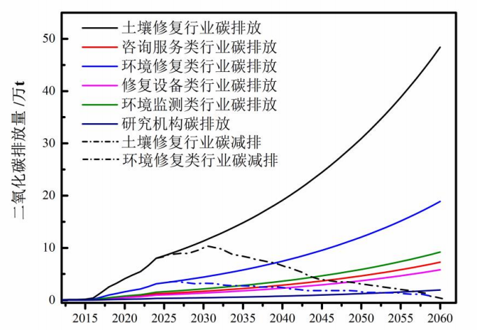 作為土壤修復產(chǎn)業(yè)鏈中核心環(huán)節(jié),土壤修復工程應放在土壤修復產(chǎn)業(yè)碳排放控制的首位,應對修復工程中修復技術擇優(yōu)選擇,選擇低碳排放或負碳排放修復技術。調(diào)整后,土壤修復工程的碳排放量會減少90%以上,其變化趨勢由實線曲線增加轉(zhuǎn)變?yōu)橄仍黾雍鬁p少至穩(wěn)定趨勢(圖5,虛線曲線)。其次,對于土壤修復產(chǎn)業(yè)鏈中上游環(huán)節(jié),應對于碳排放量第二的環(huán)境監(jiān)測類企業(yè)與第三的環(huán)境咨詢類企業(yè)進行碳減排控制,應用5G新技術、視頻會議、數(shù)據(jù)共享等可以降低碳排放。對于環(huán)境修復工程、環(huán)境監(jiān)測項目、咨詢服務項目這三項的碳排放控制,使土壤修復產(chǎn)業(yè)中“雙碳”目標的實現(xiàn)可以快速實現(xiàn)。最后,對土壤修復產(chǎn)業(yè)鏈中下游行業(yè),對于修復設備制造公司、修復藥劑制備公司以及研究中心等的碳排放進行監(jiān)測,技術升級等,減少二氧化碳的釋放。通過對土壤修復產(chǎn)業(yè)鏈的三個環(huán)節(jié)的綜合控制,針對環(huán)境修復類企業(yè)的技術導向,同時加強對環(huán)境檢測與咨詢服務類行業(yè)數(shù)據(jù)共享等使碳排放量可以在2030年前后達到峰值,2060年前達到碳中和。