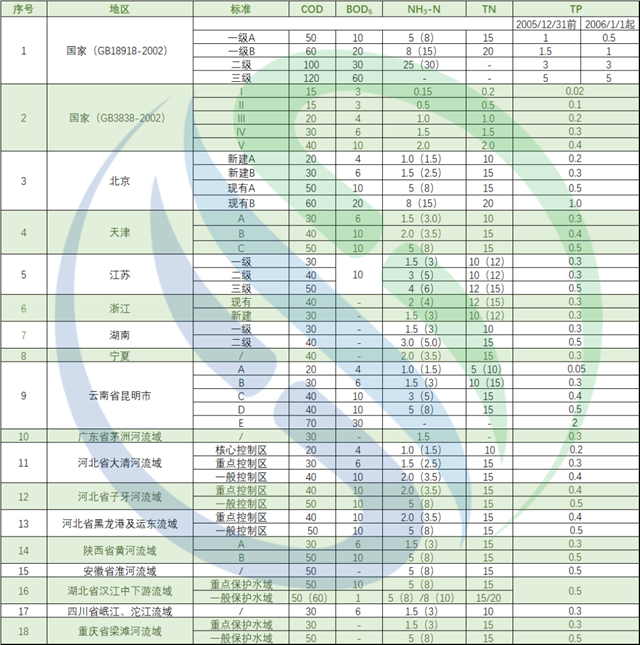 在現(xiàn)行《城鎮(zhèn)污水處理廠污染物排放標準》(GB 18918-2002)和《地表水環(huán)境質量標準》(GB3838-2002)的基礎上,北京、天津、江蘇、浙江、湖南、寧夏、云南昆明、廣州茅洲河流域、河北大清河流域、河北子牙河流域、河北黑龍港及運動流域、陜西黃河流域、安徽淮河流域、湖北漢江中下游、四川岷江沱江流域以及重慶梁灘河流域等陸續(xù)發(fā)布地方城鎮(zhèn)污水/流域污水相關排放標準。中國水網對上述各省、市城鎮(zhèn)污水及流域水污染物排放標準中COD、BOD5、NH3-N、TN以及TP共十八個標準五項指標加以整理匯總并對比,如有疏漏,歡迎留言補充!