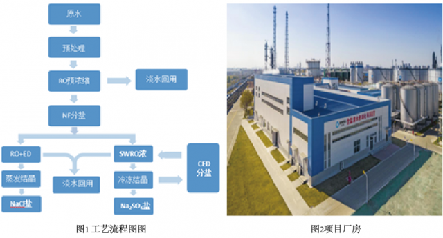 該技術(shù)通過對納濾、反滲透、均相電驅(qū)動膜和雙極膜等膜分離及膜濃縮工藝的高效集成,對高鹽廢水進行分鹽、濃縮、制酸堿及結(jié)晶等處理,實現(xiàn)廢水零排放、水和鹽的資源循環(huán)利用。膜分離和膜濃縮組合集成技術(shù)大幅減少蒸發(fā)量和蒸發(fā)器投資,同時也大幅降低了結(jié)晶分鹽的難度,實現(xiàn)氯化鈉和硫酸鈉等鹽分的分別回收利用,結(jié)晶鹽的品質(zhì)較好。