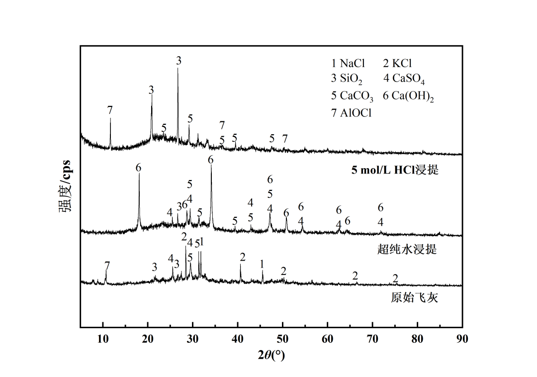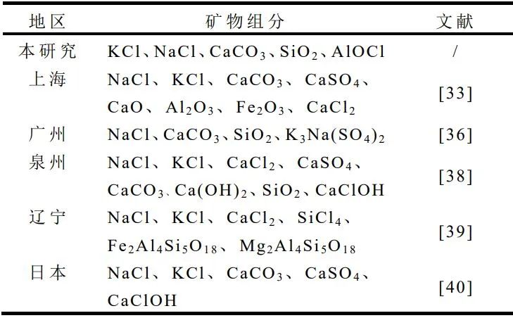 與不同地區(qū)飛灰礦物相組分對比,由表3可知,不同地區(qū)飛灰均含有碳酸鹽和硅酸鹽,且含有NaCl、KCl等可溶性氯鹽,Na、K元素來源于餐飲中食鹽等調(diào)味料的添加,高含量Cl-來源于爐排爐高溫焚燒下無機氯鹽的揮發(fā)以及垃圾成分中的廚余垃圾、塑料制品。相較于其他地區(qū),本研究還檢測到不溶氯AlOCl組分,可能是由于飛灰中Al2O3與焚燒煙氣中的酸性氣體反應(yīng)生成。