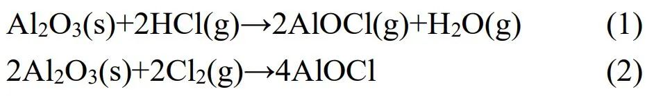 經(jīng)純水和鹽酸浸出后,飛灰中KCl和NaCl的衍射峰基本消失,表明可溶性氯鹽被脫除。飛灰經(jīng)純水浸出,出現(xiàn)明顯的水溶性較低的Ca(OH)2(ICDD 01-078-0315)衍射峰,可能是CaO等堿性氧化物與水反應(yīng)所致。鹽酸浸出后飛灰中的主要礦物相為CaCO3、SiO2(ICDD 01-075-0443)和AlOCl。大量溶解性鹽類被脫除后,性質(zhì)穩(wěn)定的SiO2衍射峰更明顯。同時,原灰中AlOCl物相的衍射特征峰明顯增強,結(jié)果表明原灰中包含不可溶氯鹽,可能是飛灰在高溫焚燒過程中產(chǎn)生的,見式(1)、(2)。