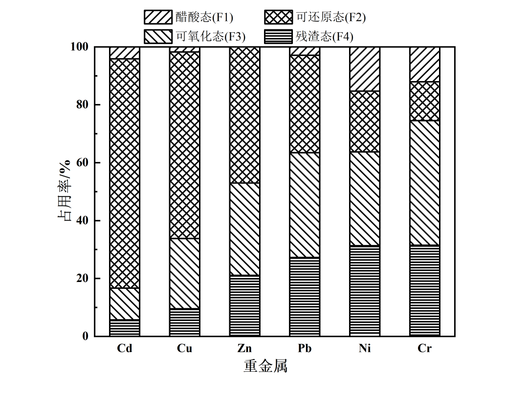 重金屬的生物有效性及潛在遷移性不僅與其總量有關(guān),還與其在飛灰中的賦存形態(tài)密切相關(guān),按照BCR分級提取法對焚燒飛灰中不同形態(tài)重金屬進行提取測定。BCR四步連續(xù)提取法將重金屬分為F1態(tài),主要含有水溶態(tài)、可交換態(tài)和碳酸鹽結(jié)合態(tài),在中性或弱酸性條件下易浸出;F2態(tài)主要是鐵錳氧化物結(jié)合態(tài),高活性的鐵錳氧化物比表面積大,對金屬離子有較大吸附容量,在還原條件下較易釋放;F3態(tài)包括有機物與硫化物結(jié)合態(tài),這一過程提取出來的重金屬,是被有機物或硫化物絡(luò)合的部分,在強氧化條件下可分解;F4態(tài)中元素主要與硅酸鹽礦物組合,在自然條件下性能穩(wěn)定,環(huán)境生態(tài)風險較小。本研究飛灰中重金屬的不同賦存形態(tài)所占百分比如圖1所示。