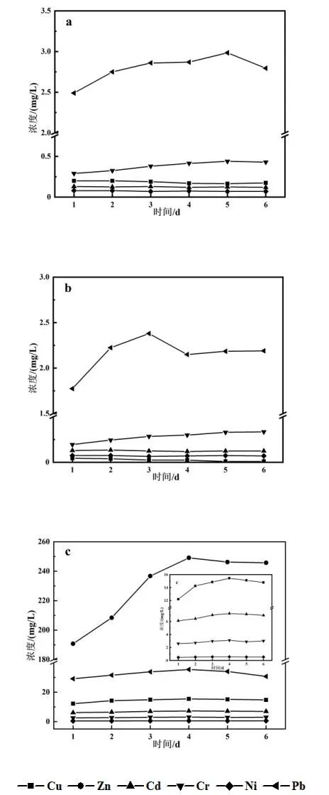圖6 不同浸提劑下飛灰中重金屬的長時間溶出(a: 1#超純水;b: 2#醋酸;c: 3# 5 mol/L HCl)