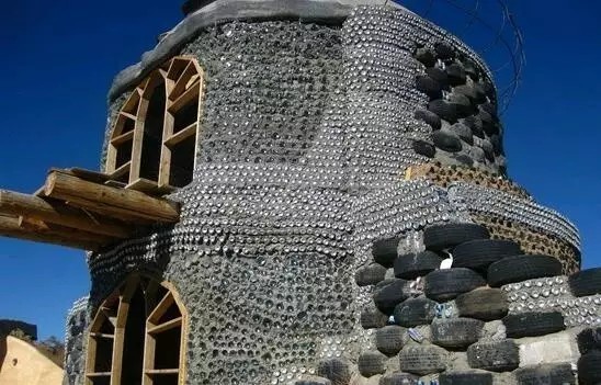 這是美國建筑師麥克·萊諾茲的作品。他的作品外形千奇百怪,而且都遵循著同一種理念:不需任何外接水電排污系統(tǒng),能夠自己發(fā)電,調(diào)溫,生產(chǎn)食物,收集循環(huán)用水;基本建材全是垃圾,廢棄輪胎、易拉罐、飲料瓶等。他給它們起了個名字:地球之舟Earthship。圖中的房子用輪胎和瓶子筑成的墻非常厚實(shí),足以抵抗九級地震。