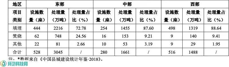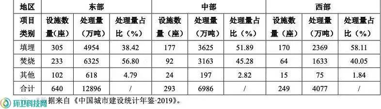 表2 2019年我國東、中、西部地區(qū)城市生活垃圾不同無害化處置技術(shù)對(duì)比* 2縣城生活垃圾填埋場(chǎng)