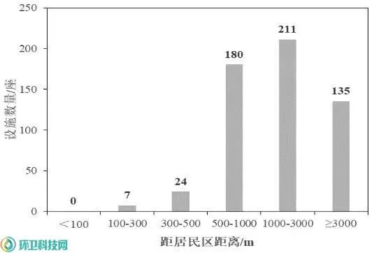 GB16889-2008規(guī)定:生活垃圾填埋場(chǎng)場(chǎng)址的位置及與周圍人群的距離應(yīng)依據(jù)環(huán)境影響評(píng)價(jià)結(jié)論確定,并經(jīng)地方環(huán)境保護(hù)行政主管部門批準(zhǔn)。由圖3可知,2010~2015年新建填埋場(chǎng)中,填埋場(chǎng)場(chǎng)址距周邊居民區(qū)小于300米的有7座,300~500米的有24座,二者占有效數(shù)據(jù)(557座)的5.6%;500~1000米的有180座,占有效數(shù)據(jù)的32.5%;而距離大于3000米以上的填埋場(chǎng)僅135座,占有效數(shù)據(jù)的24.2%?,F(xiàn)場(chǎng)調(diào)研情況和統(tǒng)計(jì)分析結(jié)果表明:距居民區(qū)1000米內(nèi)填埋場(chǎng)的惡臭投訴事件近90%,而距居民區(qū)大于3000米填埋場(chǎng)的惡臭投訴事件則幾乎沒有。