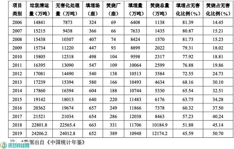 圖1 2009年至2019年城市生活垃圾不同無害化處置技術(shù)處置量及所占比例表1我國城市生活垃圾填埋發(fā)展趨勢(shì)與狀況(2006年~2019年)* 1.2填埋比例