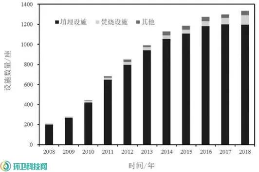 2018年全國縣級(jí)行政區(qū)域的無害化處理設(shè)施1324座,其中填埋設(shè)施1196座,2018年