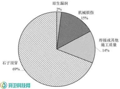 防滲層破損原因大致分為原生漏洞和次生漏洞兩種類型,其中次生漏洞又包括石子或樹根頂穿、機(jī)械損傷以及焊接問題三種類型。通過對(duì)漏洞檢測(cè)數(shù)據(jù)的統(tǒng)計(jì)分析,得出上述不同原因造成的HDPE膜破損的比例如圖4所示。