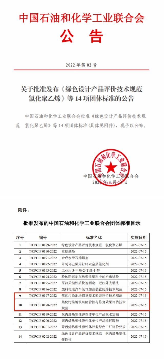 2022年4月14日,中國石油和化學(xué)工業(yè)聯(lián)合會發(fā)布公告2022年第02號,正式批準(zhǔn)《焦化污染地塊修復(fù)技術(shù)驗(yàn)證評價(jià)技術(shù)規(guī)范(T/CPCIF 0197-2022)》《焦化污染地塊風(fēng)險(xiǎn)管控與修復(fù)效果評估技術(shù)規(guī)范(T/CPCIF 0198-2022)》兩項(xiàng)團(tuán)體標(biāo)準(zhǔn)發(fā)布實(shí)施。