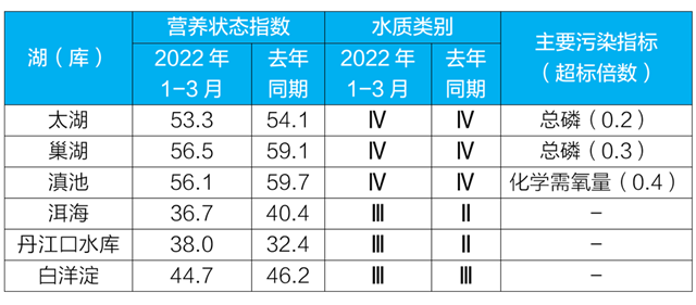 1-3月,監(jiān)測的192個(gè)重點(diǎn)湖(庫)中,水質(zhì)優(yōu)良(Ⅰ——Ⅲ類)湖庫個(gè)數(shù)占比78.1%,同比上升2.7個(gè)百分點(diǎn);劣Ⅴ類水質(zhì)湖庫個(gè)數(shù)占比4.7%,同比上升1.0個(gè)百分點(diǎn)。主要污染指標(biāo)為總磷、化學(xué)需氧量和高錳酸鹽指數(shù)。176個(gè)監(jiān)測營養(yǎng)狀態(tài)的湖(庫)中,中度富營養(yǎng)8個(gè),占4.5%;輕度富營養(yǎng)32個(gè),占18.2%;其余湖(庫)為中營養(yǎng)或貧營養(yǎng)狀態(tài)。其中,太湖和巢湖均為輕度污染、輕度富營養(yǎng),主要污染指標(biāo)為總磷;滇池為輕度污染、輕度富營養(yǎng),主要污染指標(biāo)為化學(xué)需氧量;洱海、丹江口水庫和白洋淀水質(zhì)均良好、中營養(yǎng)。