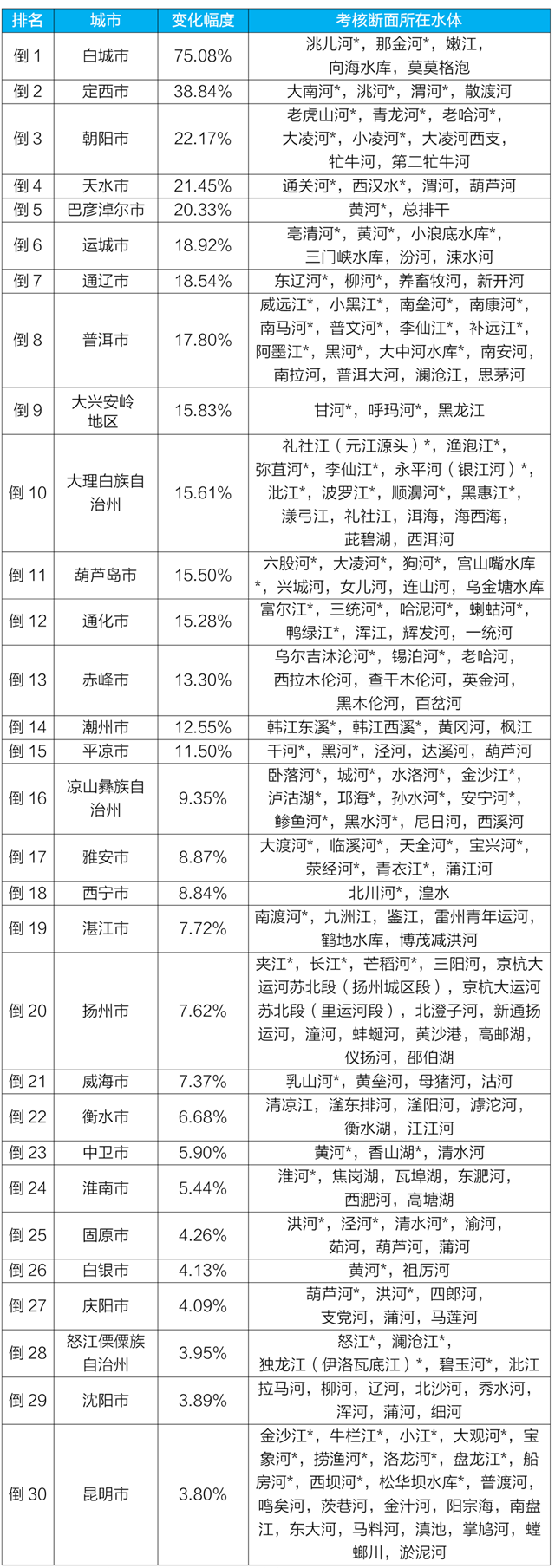 水環(huán)境質(zhì)量狀況排名后30位城市及所在水體