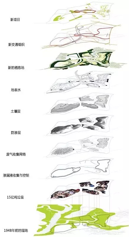 環(huán)境修復與垃圾防滲是弗萊士河公園改造初期的關鍵任務,其中運用了多層覆蓋技術,收集廢棄物產生的氣體、滲漏液的系統(tǒng)和水質檢測系統(tǒng)(圖7,圖8)。場地生態(tài)修復需達到嚴格的標準后方允許啟動各類建設項目。