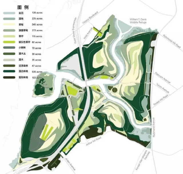 在1948年垃圾填埋場運營之前,弗萊士河區(qū)域是哈德遜河河口最大的濕地之一,50多年的垃圾填埋對生態(tài)造成了嚴重的影響。公園總體規(guī)劃旨在恢復基地原有的生態(tài)風貌與動植物棲息地,并設立了五個主要目標: