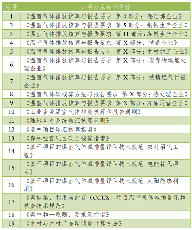 國家市場監(jiān)督管理總局對(duì)《溫室氣體排放核算與報(bào)告要求 第4部分:鋁冶煉企業(yè)》等10項(xiàng)溫室氣體碳核算標(biāo)準(zhǔn),《陸地生態(tài)系統(tǒng)碳匯核算導(dǎo)則》等3項(xiàng)碳匯核算標(biāo)準(zhǔn),《基于項(xiàng)目的溫室氣體減排量評(píng)估技術(shù)規(guī)范 農(nóng)村沼氣工程》等4項(xiàng)碳減排標(biāo)準(zhǔn),以及《碳中和—原則、要求及指南》《木材與木材產(chǎn)品碳儲(chǔ)量計(jì)算方法》等標(biāo)準(zhǔn)進(jìn)行立項(xiàng)公示。具體見下表。