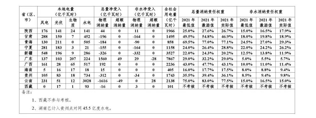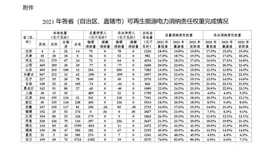 國家能源局關(guān)于2021年可再生能源電力消納責(zé)任權(quán)重完成情況的通報