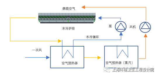 水冷爐排系統(tǒng)熱量可以用于加熱一次風(fēng),后經(jīng)過一次風(fēng)預(yù)熱器進(jìn)入焚燒爐內(nèi)燃燒,實(shí)現(xiàn)循環(huán)熱能利用,從而降低熱損失,詳見附圖6。