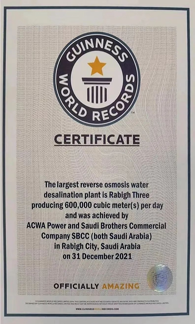 該項(xiàng)目位于沙特拉比格市,于去年12月,提前合同工期2個(gè)月投產(chǎn)。采用先進(jìn)的反滲透技術(shù),日產(chǎn)水量60萬立方米,每天可向吉達(dá)、麥加等沙特主要城市200多萬戶居民和朝圣者提供基本生活用水,甘甜的淡水不僅滋養(yǎng)了穆斯林圣地,還促進(jìn)了社會(huì)和旅游業(yè)發(fā)展。就在前不久,它還收到吉尼斯世界紀(jì)錄證書,成為世界最大單體反滲透海水淡化項(xiàng)目。