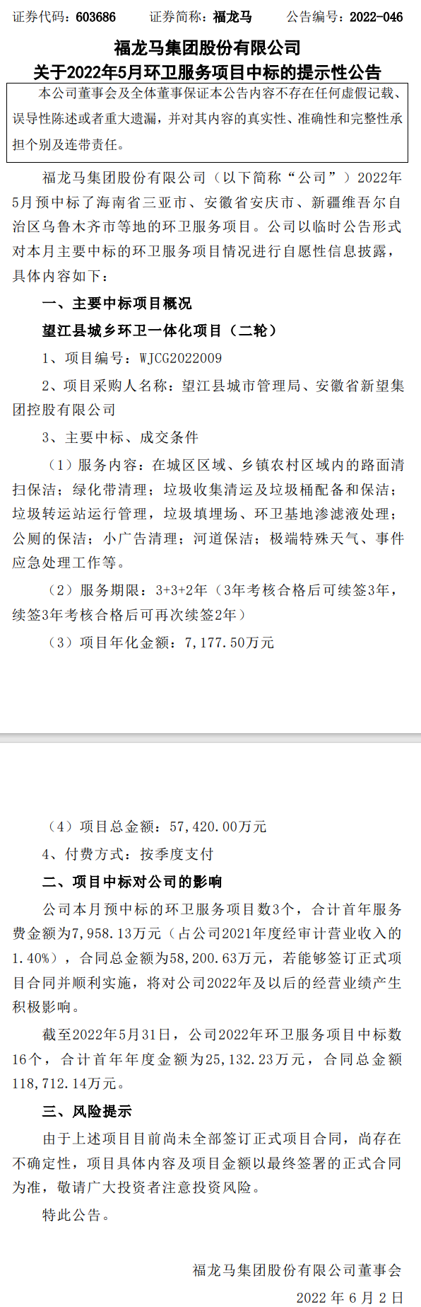 原標(biāo)題:福龍馬集團(tuán)股份有限公司關(guān)于2022年5月環(huán)衛(wèi)服務(wù)項(xiàng)目中標(biāo)的提示性公告
