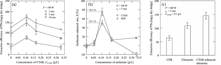 圖2 不同影響因素的提取效率。(a)不同的脈沖超聲時(shí)間下PSs的提取量與CTAB濃度之間的關(guān)系;(b)CTAB和SDS的添加濃度與表面活性劑強(qiáng)化比之間的關(guān)系;(c)三種方法下剩余污泥中高分子物質(zhì)的提取量(來自原文)