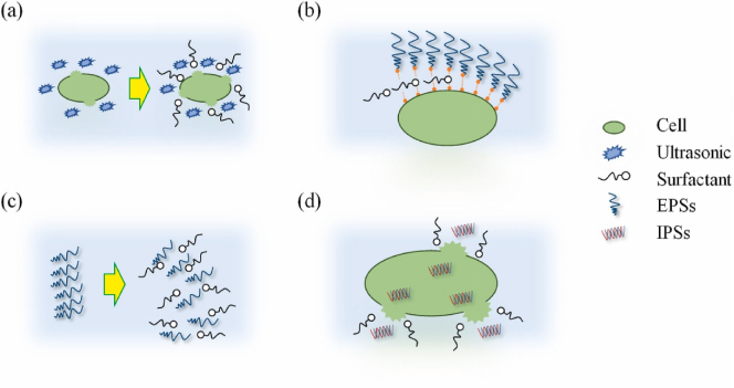 圖3 表面活性劑強(qiáng)化超聲波法提取的四種機(jī)理。(a)降低表面張力;(b)破壞EPSs與細(xì)胞體間的非共價(jià)鍵;(c)相似相溶作用;(d)破壞細(xì)胞壁或細(xì)胞膜結(jié)構(gòu)(來自原文)