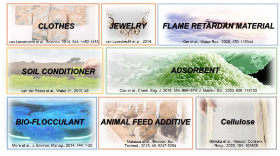 污水資源化是未來污水處理的發(fā)展方向,也是人類可持續(xù)發(fā)展的必然。自污水或污泥中提取的多糖、蛋白質(zhì)、腐殖質(zhì)、核酸、DNA、磷脂、糖醛酸和礦物質(zhì)等,可作為印染原料、首飾和服裝原料、阻燃材料、土壤調(diào)節(jié)劑、吸附劑、生物絮凝劑、飼料添加劑,應(yīng)用于水處理、農(nóng)業(yè)、園藝、造紙工業(yè)、醫(yī)療、建筑工業(yè)等領(lǐng)域,具有重大的回收價(jià)值。