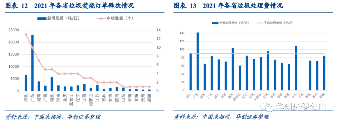 垃圾焚燒新訂單釋放速度減緩、處理費價格提升。2021年垃圾焚燒新增體量進一步下降,全年中標項目總處理規(guī)模達6.35萬噸/日,同比2020年下降15.67%。與此同時,2021年平均中標處理單價為89.63元/噸,同比2020 年增長12.73%。近三年以來中標價一直維持快速上升態(tài)勢,疊加政策推動,我們認為未來很可能按照“產(chǎn)生者付費”原則,實施居民處理費,健全收費機制,垃圾處理費單價有望進一步提升,降低對補貼依賴程度。