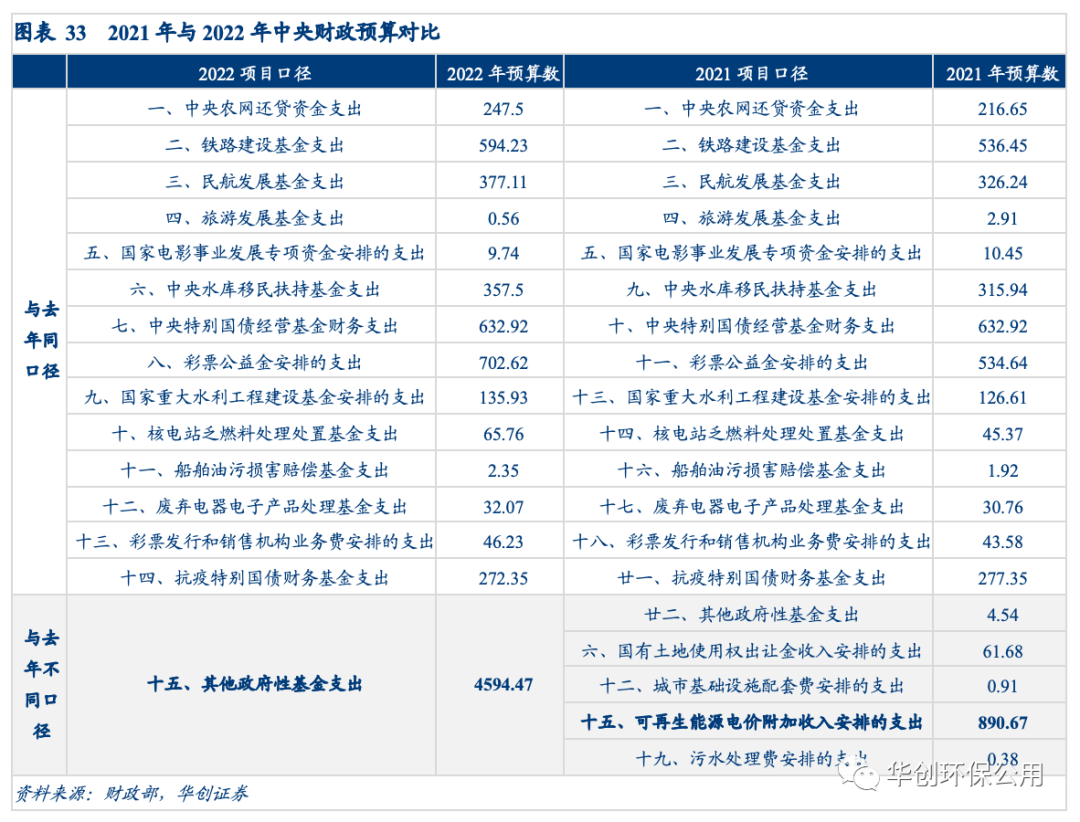 22年政府預(yù)算支出中有4500億元的補貼增量或?qū)⒂糜诳稍偕茉囱a貼的一次性發(fā)放。2022年與2021年中央財政預(yù)算支出的口徑發(fā)生了變化,其中21年出現(xiàn)的“可再生能源電價附加收入安排的支出”科目在22年的財政支出預(yù)算中消失,22年的統(tǒng)計口徑中其他政府性基金支出項目由21年的4.54億元驟增至4594.47億元。考慮到22年將21年的若干個口徑進行合并,假設(shè)除可再生能源補貼項目的其他合并項目預(yù)算支出保持不變,預(yù)計今年將能騰挪出4500億元的財政支出供可再生能源補貼的發(fā)放,此前的拖欠問題有望得到一次性解決。