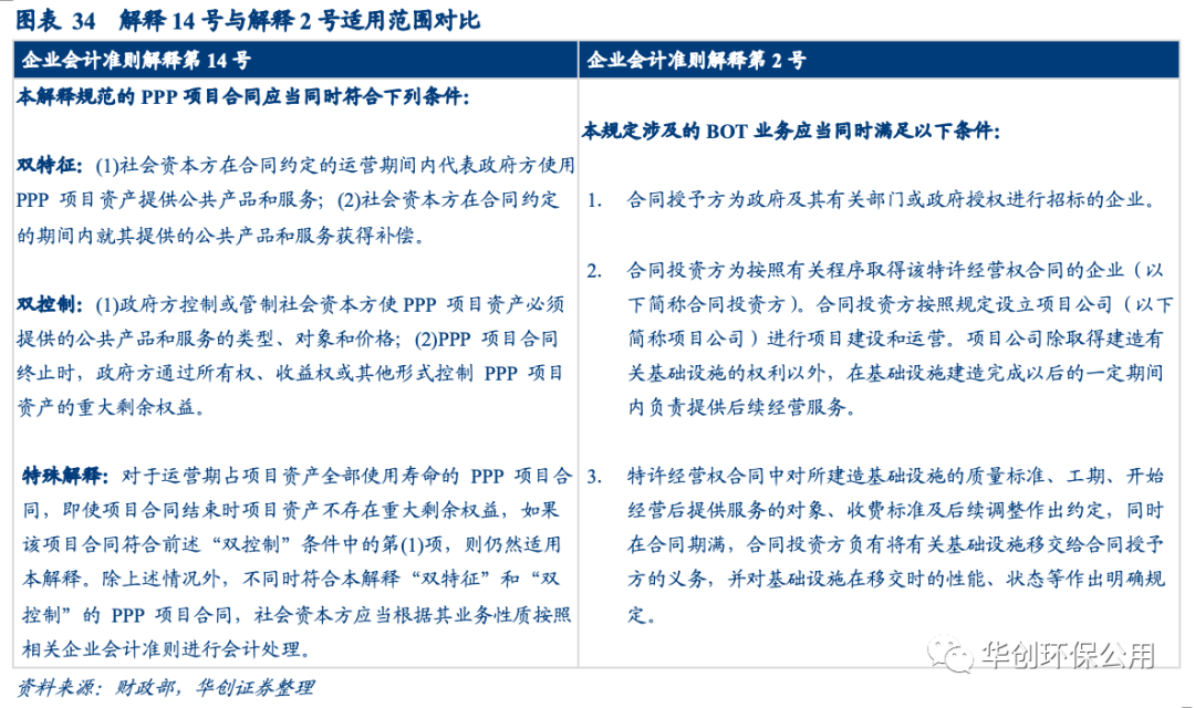解釋14號對適用范圍做出了更詳細的說明,應(yīng)當符合“雙控制”與“雙特征”。解釋2號僅對“合同授予方”、“合同投資方”、“特許經(jīng)營權(quán)”等關(guān)鍵名詞做出解釋而解釋14號則對適用范圍做出明確說明——滿足“雙控制”與“雙特征”條件,并對運營期占項目資產(chǎn)全部使用壽命項目、不符合“雙控制”與“雙特征”條件項目的處理方法做出解釋。