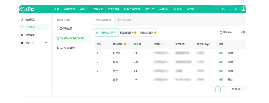 在【產品生命周期數(shù)據填寫】頁面,添加各類原材料的活動數(shù)據,包括原料名稱、消耗量和單位。