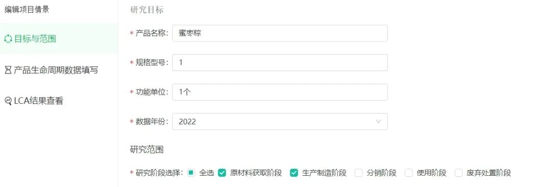選擇【產品碳足跡】板塊,填寫產品的基本信息,并選擇你要研究的范圍