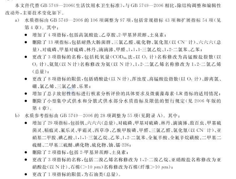 從主要技術(shù)層面上看,新標(biāo)準(zhǔn)顯示水質(zhì)指標(biāo)由GB 5749- 2006 的106 項(xiàng)調(diào)整為97項(xiàng),包括常規(guī)指標(biāo)43項(xiàng)和擴(kuò)展指標(biāo)54項(xiàng)。水質(zhì)參考指標(biāo)由GB 5749- 2006 的28項(xiàng)調(diào)整為55項(xiàng)。