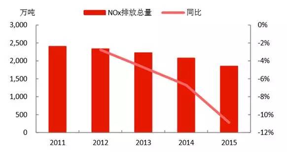 NOx的排放量為1852萬噸,“十二五”剛開始治理,當(dāng)前的下降速度還處于上升趨勢(shì),收關(guān)年2015年下降速度高達(dá)10.89%。