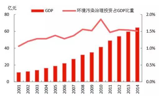 從國(guó)家統(tǒng)計(jì)局的數(shù)據(jù)可以看到,我國(guó)在環(huán)境污染治理方面的投資量,呈現(xiàn)上升趨勢(shì),2014年達(dá)到9576億元;近年占GPD的比重維持在1.5%左右,較2001年提升約0.5個(gè)百分點(diǎn)。發(fā)改委、環(huán)保部印發(fā)《關(guān)于培育環(huán)境治理和生態(tài)保護(hù)市場(chǎng)主體的意見》,提出目標(biāo),“十三五”綠色環(huán)保產(chǎn)業(yè)產(chǎn)值年均增長(zhǎng)15%以上,遠(yuǎn)高于CDP的增長(zhǎng)目標(biāo),為經(jīng)濟(jì)增長(zhǎng)注入動(dòng)力。