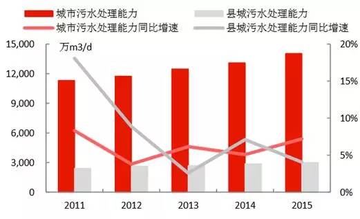 4)城市污水處理能力在2015年達(dá)到1.40億立方米/日,同比增長(zhǎng)7.19%;縣城達(dá)到2999萬立方米/日,同比增長(zhǎng)了4.06%,城市和縣城的污水處理率分別達(dá)到91.9%和85.2%,較2010年分別提升了9.6和25.1個(gè)百分點(diǎn)。