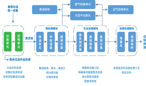 針對餐廚垃圾滲濾液中污染物的特點,泓濟環(huán)保采用分類分質(zhì)處理工藝解決對應(yīng)污染物。