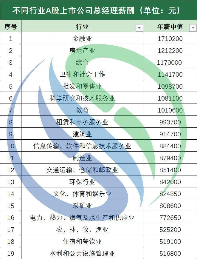 先來看看環(huán)保行業(yè)在全部A股上市公司中的排行,根據(jù)中國(guó)水網(wǎng)對(duì)A股126家環(huán)保上市公司總經(jīng)理年薪的計(jì)算結(jié)果來看,環(huán)保上市公司總經(jīng)理平均年薪約為103.18萬元,在19個(gè)行業(yè)中排第15名,可以說排名在下游圈徘徊??偨?jīng)理年薪最接近環(huán)保行業(yè)總經(jīng)理平均年薪的企業(yè)是一家主營(yíng)業(yè)務(wù)為節(jié)能環(huán)保材料的企業(yè)。