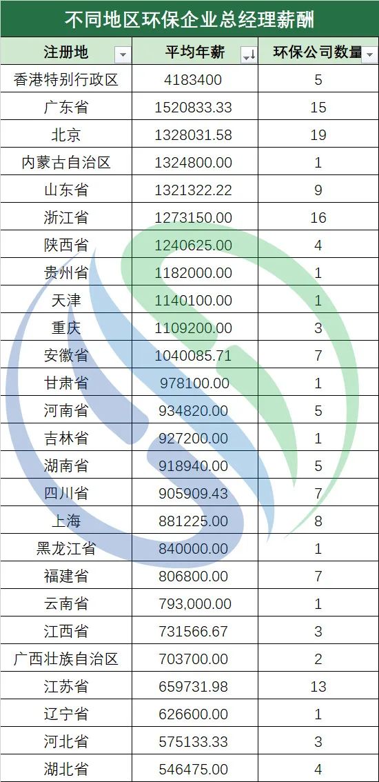 按照上市板塊來看,筆者根據(jù)wind分類結(jié)果,將143家環(huán)保上市公司劃分為主板(包括港股)、科創(chuàng)板、創(chuàng)業(yè)板、北交所四大板塊。根據(jù)各大板塊環(huán)保上市公司總經(jīng)理平均年薪水平來看,在主板上市的環(huán)保公司們以約145.46萬元的總經(jīng)理平均年薪遙遙領(lǐng)先,平均年薪高于第二名近50萬元,科創(chuàng)板和創(chuàng)業(yè)板位列第二、三名,總經(jīng)理平均年薪分別約為96.98萬元和89.91萬元,差距不是很大。剛剛成立不滿一年,上市企業(yè)數(shù)量有限的北交所則以76.29萬元的總經(jīng)理平均年薪排名第四。主板創(chuàng)立時(shí)間悠久,以傳統(tǒng)產(chǎn)業(yè)為特點(diǎn),上市企業(yè)大多具有市場(chǎng)占有率高、規(guī)模大、基礎(chǔ)好等特點(diǎn),平均年薪排名第一并不意外。科創(chuàng)板、創(chuàng)業(yè)板以及去年正式成立的北交所則以技術(shù)、創(chuàng)新為特色,為中小企業(yè)提供了多種融資渠道,這三大板塊的總經(jīng)理年薪排名也合乎現(xiàn)實(shí)情況。值得注意的是,近兩年瞄準(zhǔn)科創(chuàng)板、創(chuàng)業(yè)板、北交所登陸資本市場(chǎng)的環(huán)保企業(yè)數(shù)量逐步增多。據(jù)中國(guó)水網(wǎng)相關(guān)數(shù)據(jù)統(tǒng)計(jì)顯示,2021年,43家上市環(huán)保企業(yè)中,在創(chuàng)業(yè)板上市的環(huán)保公司有19家,在科創(chuàng)板上市的環(huán)保公司有10家,分列2021年環(huán)保公司上市渠道前二。兩大板塊作為“潛力股”,未來其業(yè)績(jī)能力值得關(guān)注,總經(jīng)理年薪水平或許也將水漲船高。再?gòu)?strong style="margin: 0px;padding: 0px;outline: 0px;box-sizing: border-box !important;overflow-wrap: break-word !important;">企業(yè)注冊(cè)地方面來看,中國(guó)水網(wǎng)所統(tǒng)計(jì)的143家環(huán)保上市公司分別來自26個(gè)省、市、自治區(qū)和特別行政區(qū)。其中,注冊(cè)地位于香港的環(huán)保上市公司總經(jīng)理平均年薪約為418.34萬元,遠(yuǎn)高于其它地區(qū),奪得地區(qū)冠軍。廣東、北京緊隨其后,分別以152.08萬元與132.8萬元位列第二、三名。可以看出,前三地區(qū)的環(huán)保公司年薪水平與地方經(jīng)濟(jì)發(fā)展水平基本保持一致。在統(tǒng)計(jì)范圍內(nèi),內(nèi)蒙古僅一家環(huán)保上市公司,受此影響排名第四,成為特例之一。特例之二是江蘇省,江蘇宜興作為環(huán)保之鄉(xiāng),是環(huán)境產(chǎn)業(yè)的搖籃,多家知名環(huán)保企業(yè)曾與宜興結(jié)下緣分,但其總經(jīng)理平均年薪排名倒數(shù)第四,薪資并不算太高。觀察發(fā)現(xiàn),注冊(cè)地位于江蘇的13家企業(yè)中,多有從事環(huán)保技術(shù)、環(huán)保設(shè)備的企業(yè),體量不大但數(shù)量眾多也是宜興乃至江蘇省環(huán)保企業(yè)的特征之一,這也在一定程度上影響了總經(jīng)理們的年薪水平。由于香港環(huán)保企業(yè)表現(xiàn)亮眼,筆者從上市地點(diǎn)角度對(duì)港股市場(chǎng)環(huán)保企業(yè)和A股市場(chǎng)環(huán)保企業(yè)的總經(jīng)理年薪水平也進(jìn)行了分析:先回顧A股環(huán)保公司總經(jīng)理年薪水平,126家環(huán)保企業(yè)總經(jīng)理平均年薪約為103.18萬元,年薪中位值約為84.2萬元。17家港股環(huán)保上市公司總經(jīng)理平均年薪約為229.41萬元,是A股環(huán)保企業(yè)的兩倍有余。年薪最高的一家港股環(huán)保公司總經(jīng)理年薪超過了1200萬元,第二、第三名也都超過了400萬元,最低的一家為15萬元左右,年薪水平相差較大。港股17家環(huán)保公司年薪中位值約為169.3萬元。同時(shí),筆者發(fā)現(xiàn),這些港股環(huán)保公司大多來自香港、廣東、北京等經(jīng)濟(jì)水平較發(fā)達(dá)的地區(qū)。可看出,港股環(huán)保上市公司總經(jīng)理年薪整體水平較A股更高,但內(nèi)部存在較大懸殊,相當(dāng)一部分港股環(huán)保公司和A股市場(chǎng)環(huán)保公司總經(jīng)理年薪水平較接近。如果僅憑以上信息,就斷言A股上市公司總經(jīng)理的收入不如港股上市公司,卻是錯(cuò)誤的。這是因?yàn)锳股和港股總經(jīng)理的收入差異主要來源于披露準(zhǔn)則不同。A股披露依據(jù)證監(jiān)會(huì)頒布的《公開發(fā)行證券的公司信息披露內(nèi)容與格式準(zhǔn)則第2號(hào)年度報(bào)告的內(nèi)容與格式》。其中明確:“將獲得的股權(quán)激勵(lì)按照可行權(quán)股數(shù)、已行權(quán)數(shù)量、行權(quán)價(jià)以及報(bào)告期末市價(jià)單獨(dú)列示,”即A股披露的總經(jīng)理年薪中不包括股權(quán)激勵(lì)部分。而港股披露的年薪中必須包括股權(quán)激勵(lì)的賬面變化。哪行賺錢?