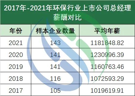 以上趨勢(shì)和環(huán)保行業(yè)整體薪資水平基本保持一致。對(duì)此,中國(guó)水網(wǎng)也曾在《21年平均工資公布!環(huán)保類收入排名依然倒數(shù),且增速墊底》一文中分析過這背后的三層原因:第一,是外部的不確定因素增加。2018年,嚴(yán)控金融風(fēng)險(xiǎn)使財(cái)稅政策和金融政策持續(xù)收緊,以及PPP項(xiàng)目規(guī)范化調(diào)整等,讓企業(yè)面臨新的融資困境,一部分企業(yè)已經(jīng)因此受到了嚴(yán)重打擊。而2020年持續(xù)至今的新冠疫情則將環(huán)境產(chǎn)業(yè)和企業(yè)發(fā)展推向變中之變。疫情的影響在過去五年環(huán)保上市公司總經(jīng)理年薪對(duì)比數(shù)據(jù)中尤為明顯:2017年到2020年環(huán)保上市公司總經(jīng)理年薪穩(wěn)步上升,從2017年的101.96萬元上升至2020年的123.1萬元,上升幅度超21萬元。到了2020年,受疫情影響,各大環(huán)保企業(yè)面臨停工停產(chǎn)等問題,或許是企業(yè)管理層對(duì)未來預(yù)計(jì)不樂觀,多家企業(yè)下調(diào)了2021年企業(yè)年薪水平。總經(jīng)理平均年薪由2020年的123.1萬元下降至2021年的118.18萬元,下降幅度近5萬元。▼注:圖中樣本企業(yè)數(shù)量來源于wind不過不用慌,從年薪中位數(shù)來看,環(huán)保行業(yè)過去5年來的總經(jīng)理年薪水平還是保持了穩(wěn)定的增長(zhǎng)趨勢(shì),從2017年至2021年,上漲近24萬元,增長(zhǎng)達(dá)38.29%。第二,是企業(yè)盈利難度提升。根據(jù)上市環(huán)保企業(yè)已經(jīng)發(fā)布的2021年業(yè)績(jī)情況整體來看,2021年環(huán)保產(chǎn)業(yè)的盈利水平較2020年有所下降,有多家企業(yè)的凈利潤(rùn)出現(xiàn)了虧損,有約近四成的企業(yè)出現(xiàn)了凈利潤(rùn)的下滑,其中有個(gè)別企業(yè)下滑幅度相對(duì)較大。第三,是民營(yíng)企業(yè)經(jīng)營(yíng)難。國(guó)企大舉接盤環(huán)保民營(yíng)企業(yè)浪潮的推進(jìn),帶來了行業(yè)的重新洗牌。在經(jīng)濟(jì)下行壓力下,國(guó)際形勢(shì)的不確定性、疫情的反復(fù)等等因素都為民營(yíng)企業(yè)的經(jīng)營(yíng)帶來了挑戰(zhàn)。證券市場(chǎng)風(fēng)云變幻