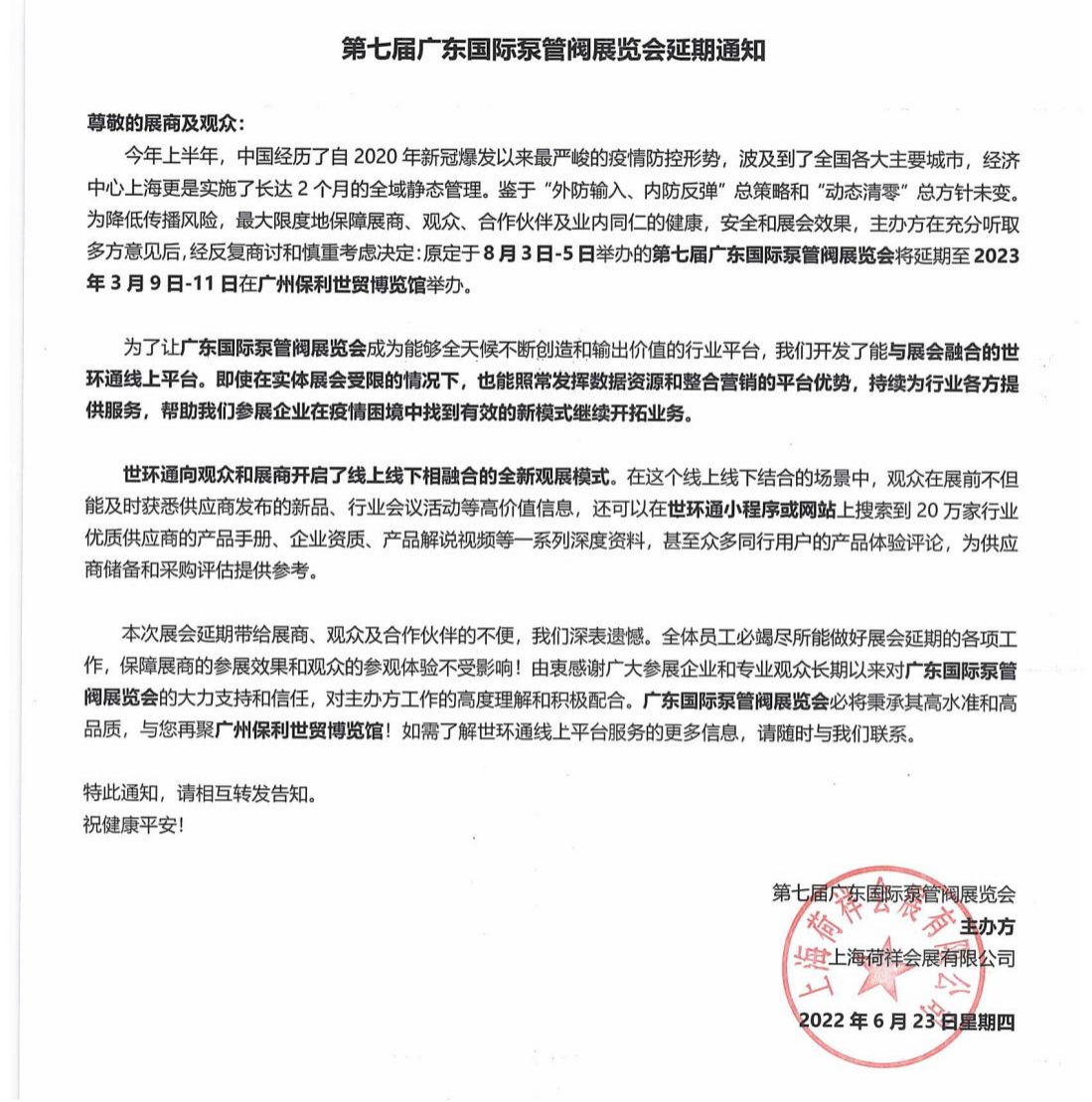 今年上半年,中國經(jīng)歷了自2020年新冠爆發(fā)以來最嚴(yán)峻的疫情防控形勢,波及到了全國各大主要城市,經(jīng)濟(jì)中心上海更是實(shí)施了長達(dá)2個(gè)月的全域靜態(tài)管理。鑒于“外防輸入、內(nèi)防反彈”總策略和“動(dòng)態(tài)清零”總方針未變。為降低傳播風(fēng)險(xiǎn),最大限度地保障展商、觀眾、合作伙伴及業(yè)內(nèi)同仁的健康,安全和展會(huì)效果,主辦方在充分聽取多方意見后,經(jīng)反復(fù)商討和慎重考慮決定:原定于8月3日-5日舉辦的第七屆廣東國際泵管閥展覽會(huì)將延期至2023年3月9日-11日在廣州保利世貿(mào)博覽館舉辦。