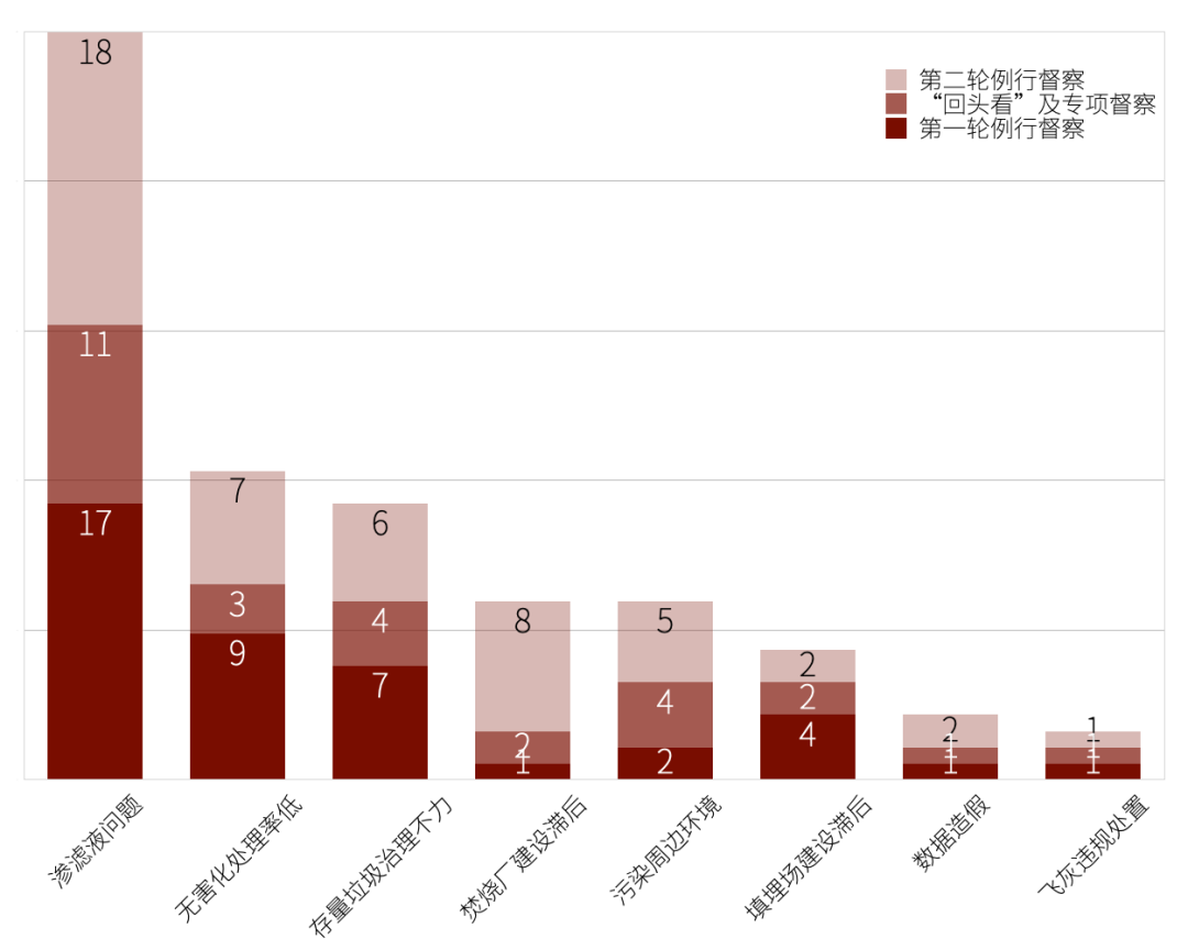 中央環(huán)保督察作為中國(guó)生態(tài)文明建設(shè)的一項(xiàng)重大制度創(chuàng)新,是落實(shí)環(huán)境保護(hù)“黨政同責(zé)”“一崗雙責(zé)”主體責(zé)任的重要舉措,具有代表中央權(quán)威、剛性約束、公眾參與、持續(xù)追蹤等特征。2015年開始至2022年6月,中央環(huán)保督察組共完成了2輪針對(duì)31個(gè)省區(qū)市的例行督察和1輪針對(duì)20個(gè)省區(qū)市的“回頭看”及專項(xiàng)督察,其中“生活垃圾”作為與公眾生活息息相關(guān)的議題,在中央環(huán)保督察工作組向各省區(qū)市反饋督察情況時(shí)頻繁出現(xiàn),個(gè)別嚴(yán)重問(wèn)題因整改不力被公眾反復(fù)舉報(bào)。統(tǒng)計(jì)發(fā)現(xiàn),82份反饋意見中有60份涉及生活垃圾問(wèn)題,分類統(tǒng)計(jì)歸納為兩大類22個(gè)小項(xiàng)共包含161次生活垃圾問(wèn)題(部分省份的單份反饋意見中同時(shí)包括多個(gè)不同的生活垃圾問(wèn)題),其中滲濾液違規(guī)處理問(wèn)題最為突出、飛灰違規(guī)處置等問(wèn)題反復(fù)出現(xiàn)、焚燒廠建設(shè)滯后等階段性出現(xiàn)。中央環(huán)保督察源自2015年7月中央全面深化改革領(lǐng)導(dǎo)小組第十四次會(huì)議,會(huì)議審議通過(guò)《環(huán)境保護(hù)督察方案(試行)》,也標(biāo)志著中央生態(tài)環(huán)境保護(hù)督察制度(原中央環(huán)境保護(hù)督察,一般稱中央環(huán)保督察)正式建立。