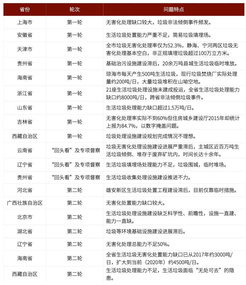 個(gè)別省區(qū)市歷史上無(wú)害化處理率低、無(wú)害化處理能力不足問(wèn)題嚴(yán)重。其中,山東省在第一輪例行督察中被中央環(huán)保督察組反饋“生活垃圾處理能力缺口超過(guò)1.5萬(wàn)噸/日”、云南省在“回頭看”及專項(xiàng)督察中被反饋“垃圾無(wú)害化處理設(shè)施建設(shè)進(jìn)展嚴(yán)重滯后,主城區(qū)近百萬(wàn)噸生活垃圾傾倒、堆存于廢棄礦坑內(nèi),時(shí)間長(zhǎng)達(dá)十余年”、北京市第二輪例行督察被反饋“生活垃圾處理設(shè)施建設(shè)缺乏科學(xué)性、前瞻性,設(shè)施一直建、能力一直缺”等。具體情況詳見表1。