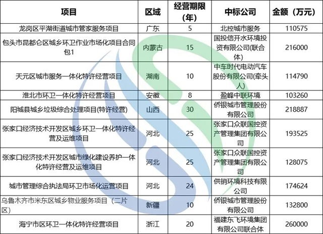 東飛環(huán)境、北控城市服務(wù)等傳統(tǒng)環(huán)衛(wèi)企業(yè),上半年同樣表現(xiàn)不俗。東飛環(huán)境中標(biāo)3個(gè)億級(jí)項(xiàng)目,合同額31.25億,同時(shí),東飛環(huán)境以聯(lián)合體成員身份攜手浙江海云環(huán)保中標(biāo)了上半年合同金額最高的環(huán)衛(wèi)項(xiàng)目,海寧市區(qū)環(huán)衛(wèi)一體化特許經(jīng)營項(xiàng)目,中標(biāo)價(jià):116432911元/年,另算使用者付費(fèi):其他垃圾收集和轉(zhuǎn)運(yùn)12256867元/年+糞便清運(yùn)及處理有償收費(fèi)773500元/年,特許經(jīng)營期年限20年,合計(jì)總金額達(dá)26億元;北控城市服務(wù)中標(biāo)4個(gè)億級(jí)項(xiàng)目,合同總額23.96億,包括深圳兩個(gè)街道的大管家項(xiàng)目,合同總額近20億。