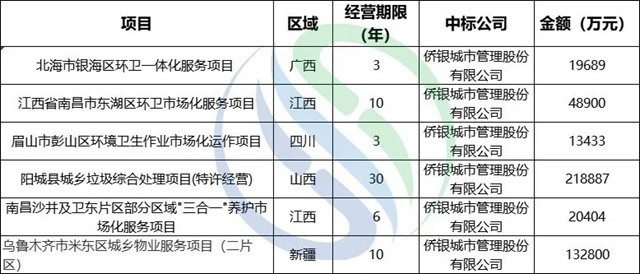 上半年,僑銀股份以6個(gè)項(xiàng)目,45.41億的合同排名第二!項(xiàng)目區(qū)域分布較為分散。目前,僑銀股份的城市大管家服務(wù)布局全國百城,標(biāo)桿項(xiàng)目包括合同額67億元的昆明官渡一體化PPP項(xiàng)目、廣州市本級(jí)環(huán)衛(wèi)一體化PPP項(xiàng)目等。