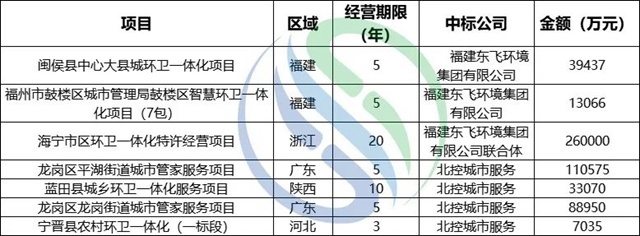 東飛環(huán)境和北控城市服務(wù)上半年億級(jí)項(xiàng)目中標(biāo)情況