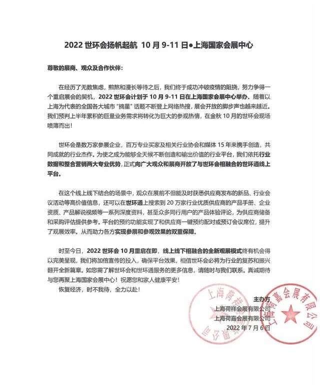 在經(jīng)歷了無數(shù)焦慮,煎熬和漫長等待之后,我們終于成功沖破疫情的阻撓,努力爭得一個重啟展會的契機(jī),2022世環(huán)會計劃于10月9-11日在上海國家會展中心舉辦。隨著以上海為代表的全國各大城市“摘星”話題不斷登上網(wǎng)絡(luò)熱搜,展會開放的腳步聲也越來越近。我們預(yù)判上半年累積的巨量業(yè)務(wù)需求將轉(zhuǎn)化為巨大的參觀熱情,在金秋10月的世環(huán)會現(xiàn)場噴薄而出!